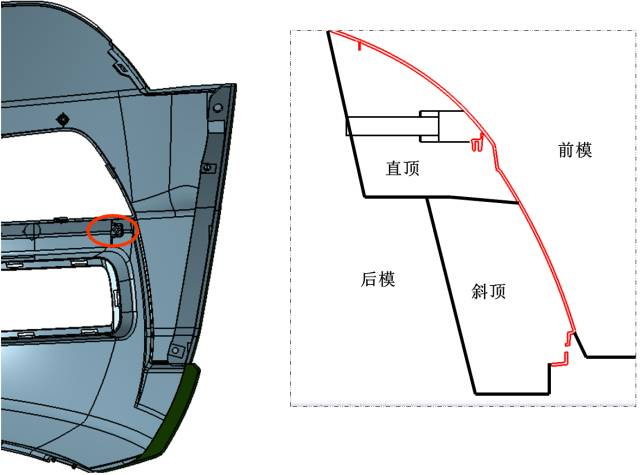 在汽車注塑模具中,針對汽車保險杠產品,模具設計時通常會采用先進的內分型面技術。其優點是分型夾線隱藏在保險杠的非外觀面上,在汽車上裝配后看不到外觀夾線,不會影響產品外觀。但這種技術在難度與結構上都要比外分型保險杠復雜,技術風險也較高,模具成本與模具價格也會高于外分型保險杠很多,但因外觀美觀,在中高檔汽車中被廣泛應用。